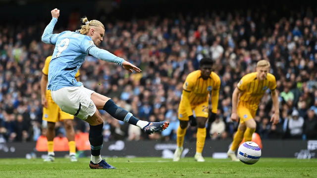 Erling Haaland became the first player to reach 100 Premier League goal involvements in fewer than 100 games when he marked his 94th appearance in the competition with his 84th goal by sending Brighton keeper Bart Verbruggen the wrong way with his 11th-minute penalty.